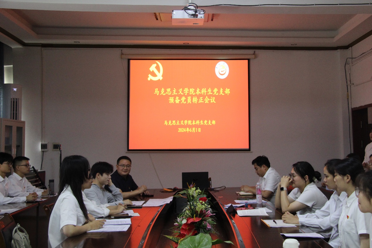 本网讯(通讯员 朱思瑾)2024年6月1日下午,马克思主义学院本科生党支部于院会议室召开预备党员转正会议。马克思主义学院党委副书记张旺、本科生党支部书记袁梓翔出席本次会议,本科生党支部李文杰同志主持本次会议,本科生党支部全体成员线上线下参会。